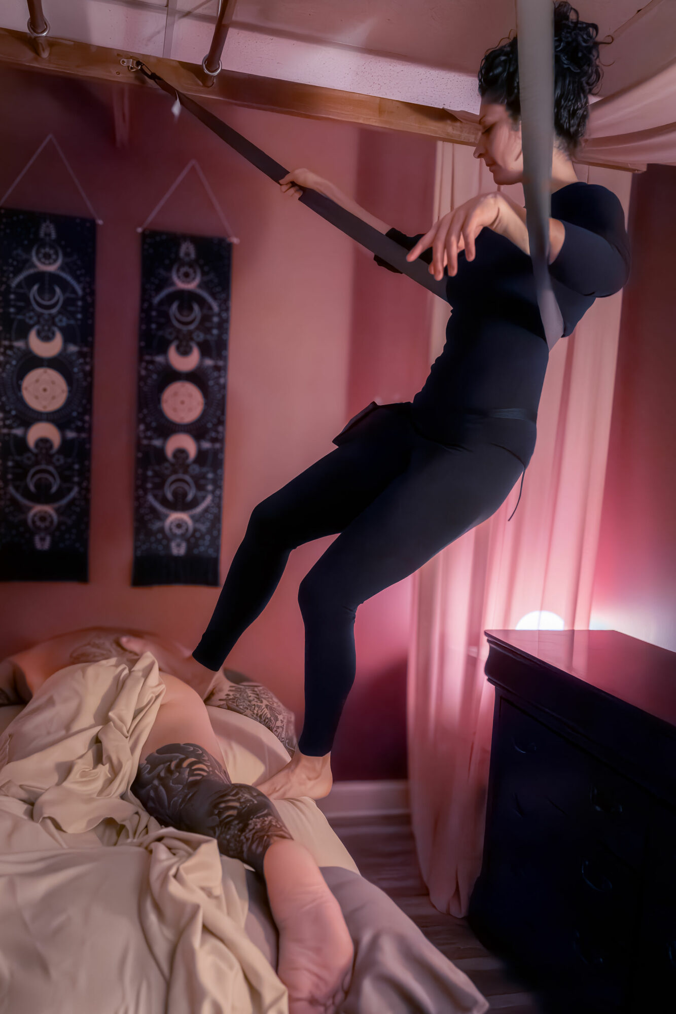 One of the benefits of working with gravity is that I can hold steady, sustained pressure on a problem spot without fatiguing, and often from a more strategic angle and direction than my hands could provide. Because feet are broader than hands, pressure gets distributed over a wider surface area and makes it easier for the client to receive the deeper work without soreness afterward. A rounded heel is a far more pleasant tool than a pointy elbow, but can still be just as specific! The outcome is a massage that’s deeper, more effective, and yields longer lasting results.