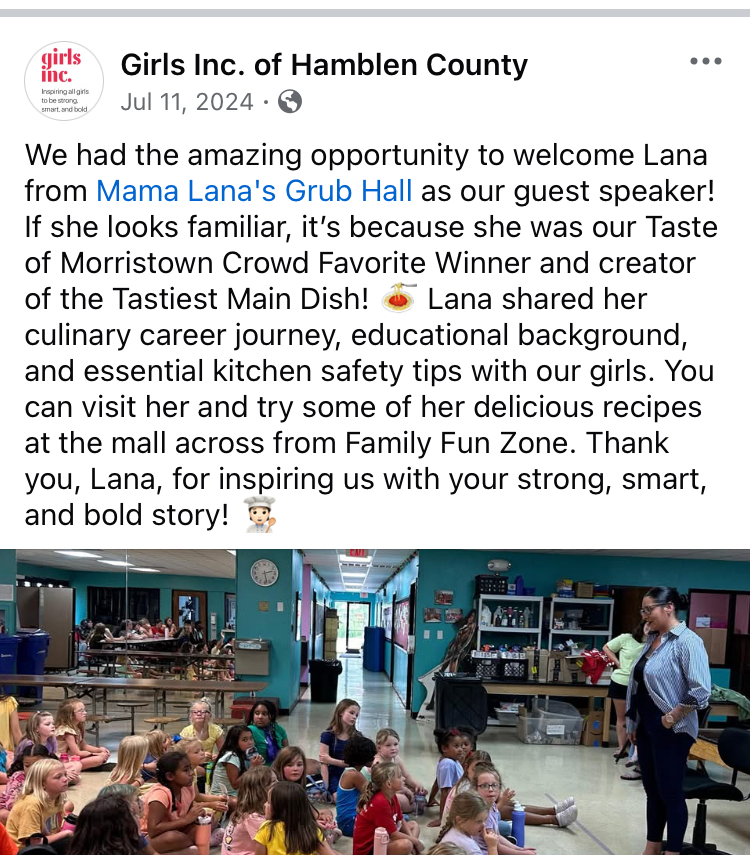 Mama Lana’s kitchen was established in 2022. Mama Lana’s grub hall was established in 2023. Since then The Grub Hall has won 2 consecutive “ Taste of Morristown” competitions , has been awarded the “ Horizon” award by the Morristown Chamber of Commerce, and was recently nominated for “Tennessee Best”.