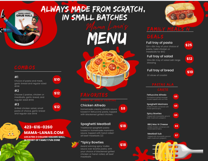 Mama Lana’s Grub Hall is my brick and mortar Italian food establishment that specializes in made from scratch Italian cuisines with an all under $10 menu.